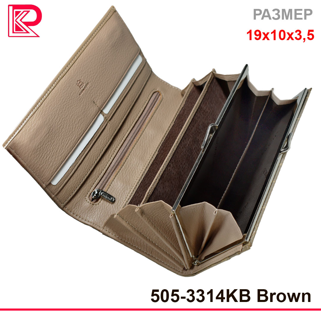 Классический кошелек из глянцевой эко кожи бежевого цвета с крупной текстурой рептилии. Закрывается на магнит. Основное отделение разделено на четыре части (одно состоит из двух отделов и закрывается на защелку). Также имеется отдел для монет на молнии, открытый большой карман и 6 маленьких для визиток и кредитных карт. На тыльной внешней стороне - дополнительный открытый карман. Лицевая наружная сторона модели украшена декоративным тиснением названия бренда. Изделие упаковано в фирменную коробку.