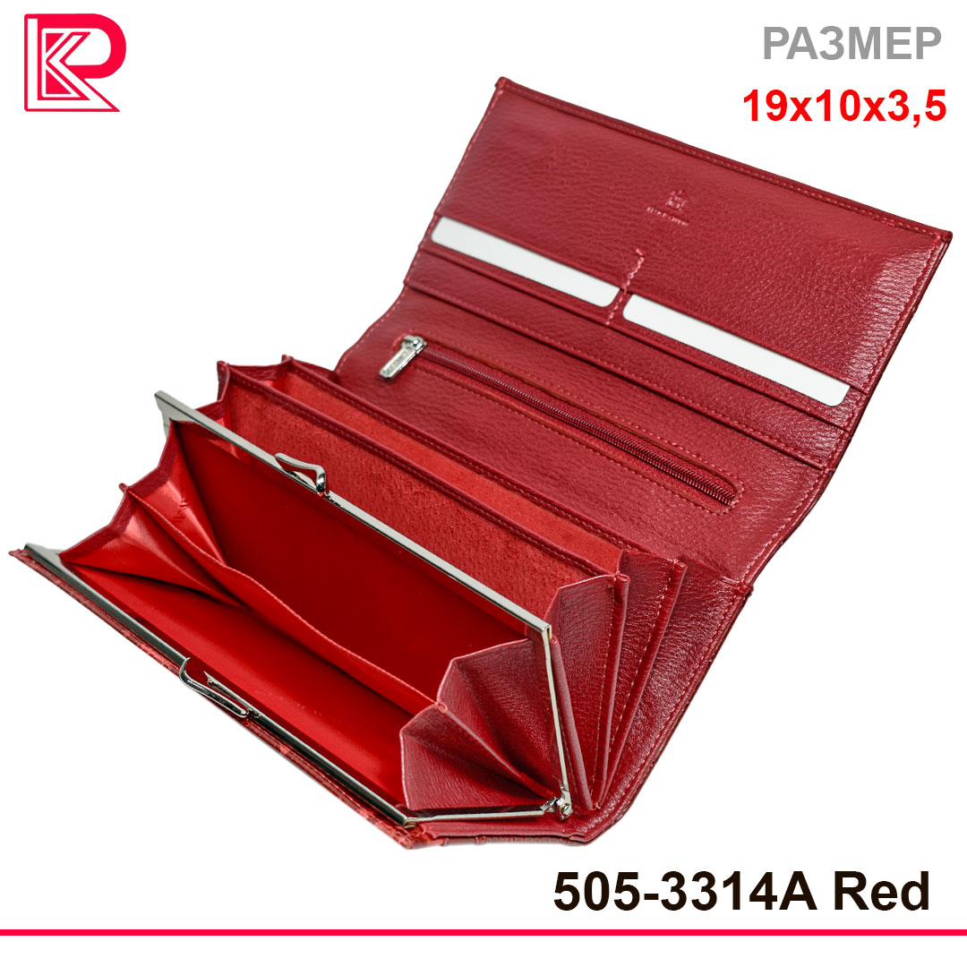 Классический кошелек из глянцевой эко кожи красного цвета с крупной текстурой рептилии. Закрывается на магнит. Основное отделение разделено на четыре части (одно состоит из двух отделов и закрывается на защелку). Также имеется отдел для монет на молнии, открытый большой карман и 6 маленьких для визиток и кредитных карт. На тыльной внешней стороне - дополнительный открытый карман. Лицевая наружная сторона модели украшена декоративным тиснением названия бренда. Изделие упаковано в фирменную коробку.
