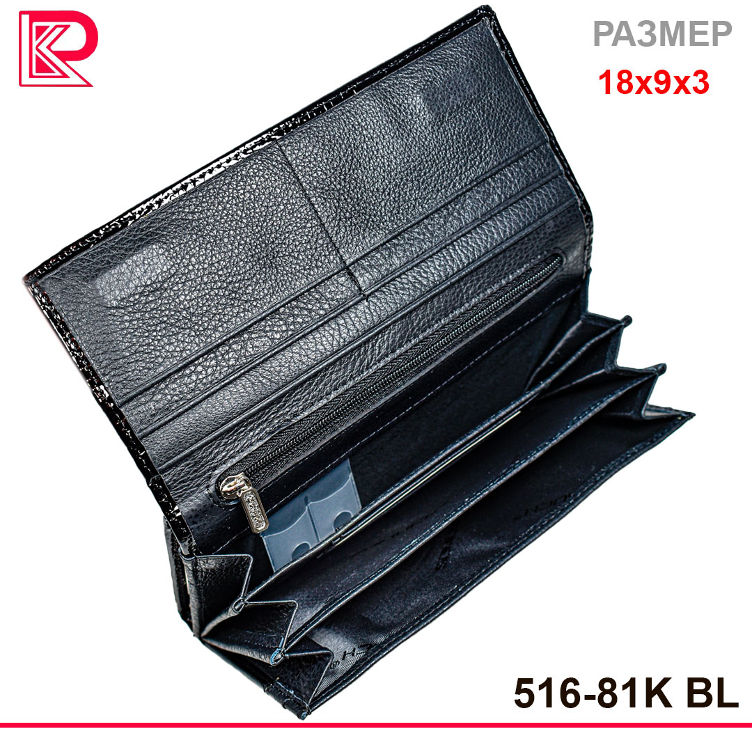 Классический лакированный кошелек черного цвета с текстурой мелкая рептилия из эко-кожи. Основная часть модели закрывается на скрытые магниты. Состоит из трех отсеков для купюр, открытого кармана и кармана на молнии для документов. Также внутри имеется одиннадцать мест для пластиковых карт, два кармашка для sim-карт и карт памяти. Соседний отдел кошелька закрывается на защелку, состоит двух отсеков. Внутренняя сторона изделия украшена тиснением логотипа, внешняя - декоративным металлическим элементом с названием бренда. Упакован кошелек в фирменную коробку.
