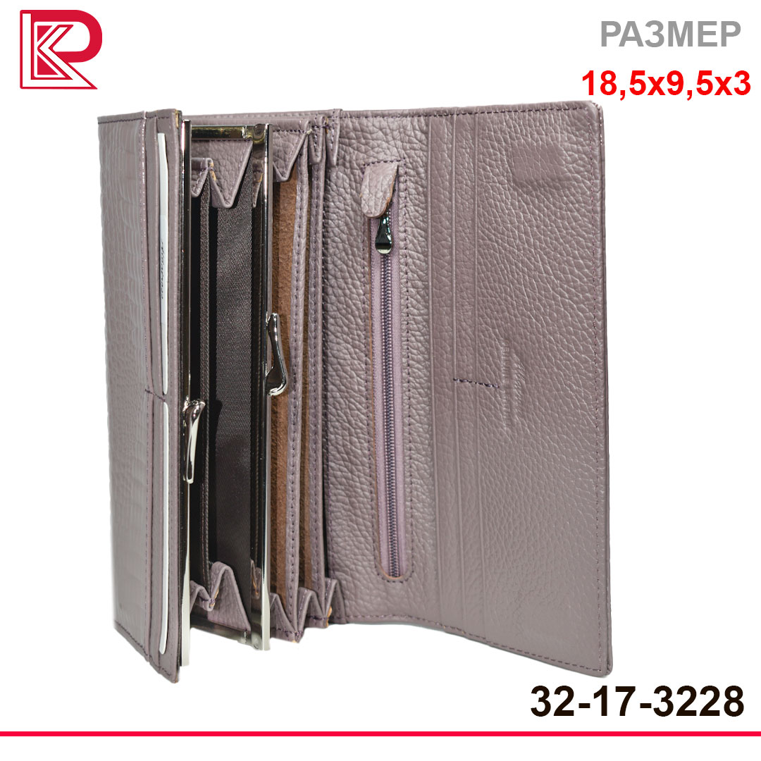 Стильный классический кошелек сиреневого цвета из лакированной натуральной кожи с текстурой рептилии. В модели присутствует 3 отделения для купюр, два отдела для монет на защелке, 8 маленьких карманов для карт и визиток, один закрытый на молнию карман. На тыльной внешней стороне - дополнительный открытый карман. Закрывается кошелек на магниты. Изделие украшено металлическим декоративным элементом с названием бренда. Упаковано в фирменную коробку от производителя.