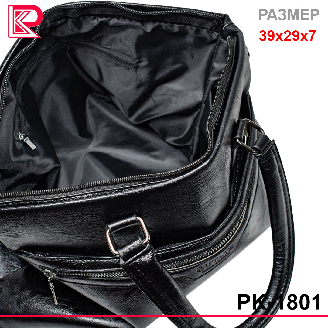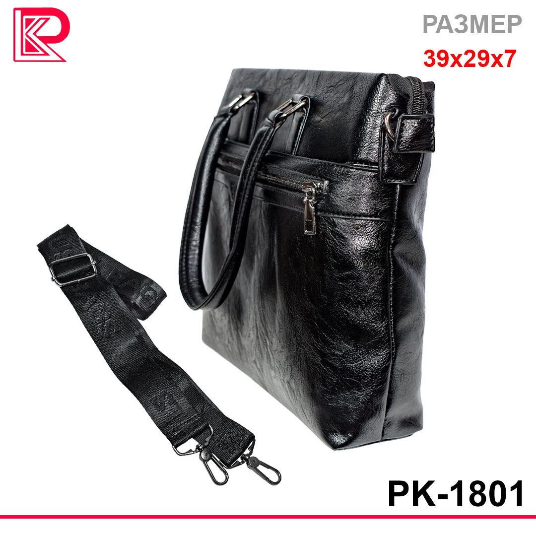 Большая функциональная мужская сумка матового черного цвета, размером 39х29х7 сантиметров, выполненная из экокожи. Может использоваться (в том числе) для переноски 15-ти дюймового ноутбука. Основной отдел закрывается на застежку-молнию. Внутри также есть встроенное дополнительное отделение с клапаном-липучкой. С лицевой стороны сумки имеются отделение и карман, закрывающиеся на молнию. Тыльная наружная сторона также имеет карман на молнии. Для удобного ношения на плече в комплект входит регулируемый по длине съемный ремень с карабинами. Фактура материала, из которого сделана сумка, по структуре напоминает мелкий "деревянный" рисунок. Лицевая сторона сумки декорирована логотипом.