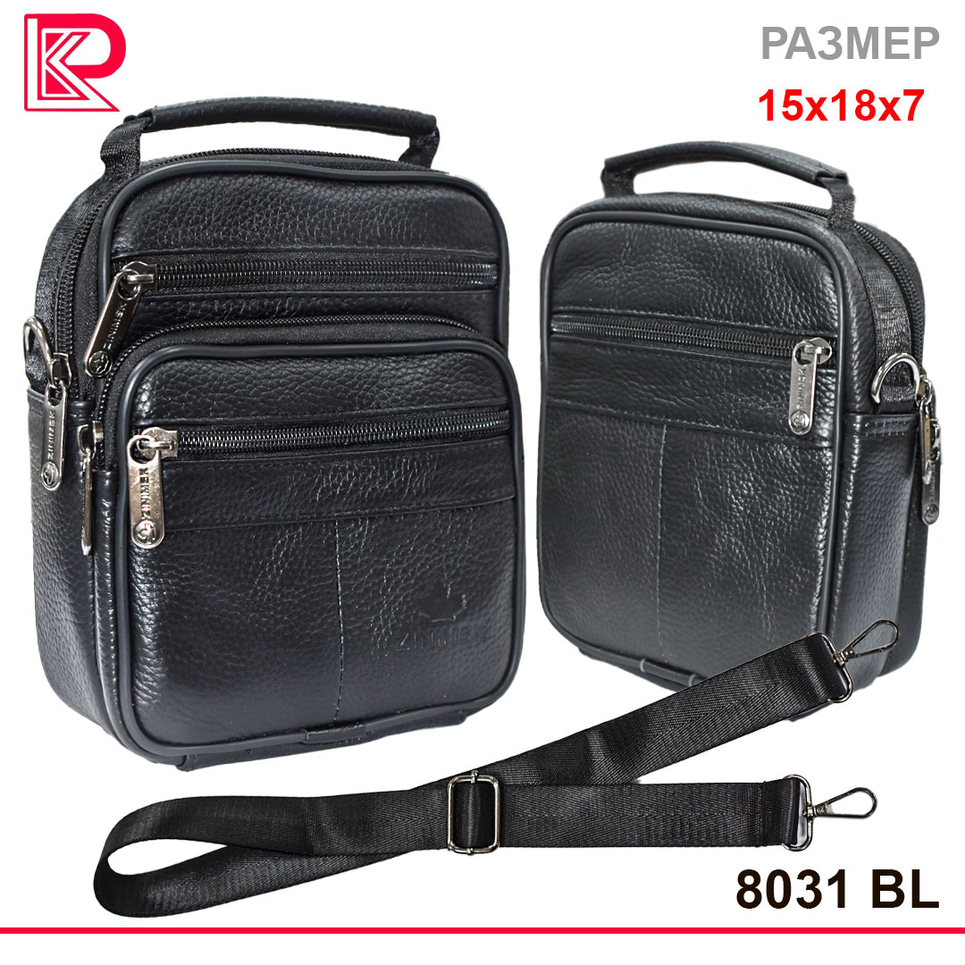 Стильная мужская сумочка из натуральной кожи, снабжена удобной ручкой для переноса в руках и съемным ремнем с карабинами в комплекте. В центральном большом отделении (замок- молния) есть небольшой дополнительный карман для документов на молнии. Второе отделение поменьше расположено на лицевой стороне сумки и закрывается на молнию. Также лицевая сторона имеет два кармана для документов или монет, на тыльной стороне - один карман на молнии. Изделие украшено тиснением логотипа. Упакована сумка в пакет.