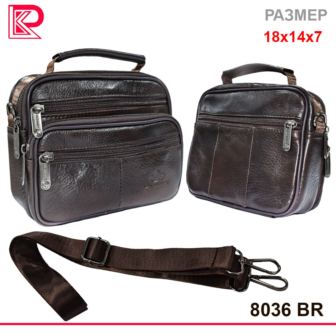 Стильная мужская сумочка из натуральной кожи, снабжена удобной ручкой для переноса в руках и съемным ремнем с карабинами в комплекте. В центральном большом отделении (замок- молния) есть небольшой дополнительный карман для документов на молнии. Второе отделение поменьше расположено на лицевой стороне сумки и закрывается на молнию. Также лицевая сторона имеет два кармана для документов или монет, на тыльной стороне - один карман на молнии. Изделие украшено тиснением логотипа. Упакована сумка в пакет.