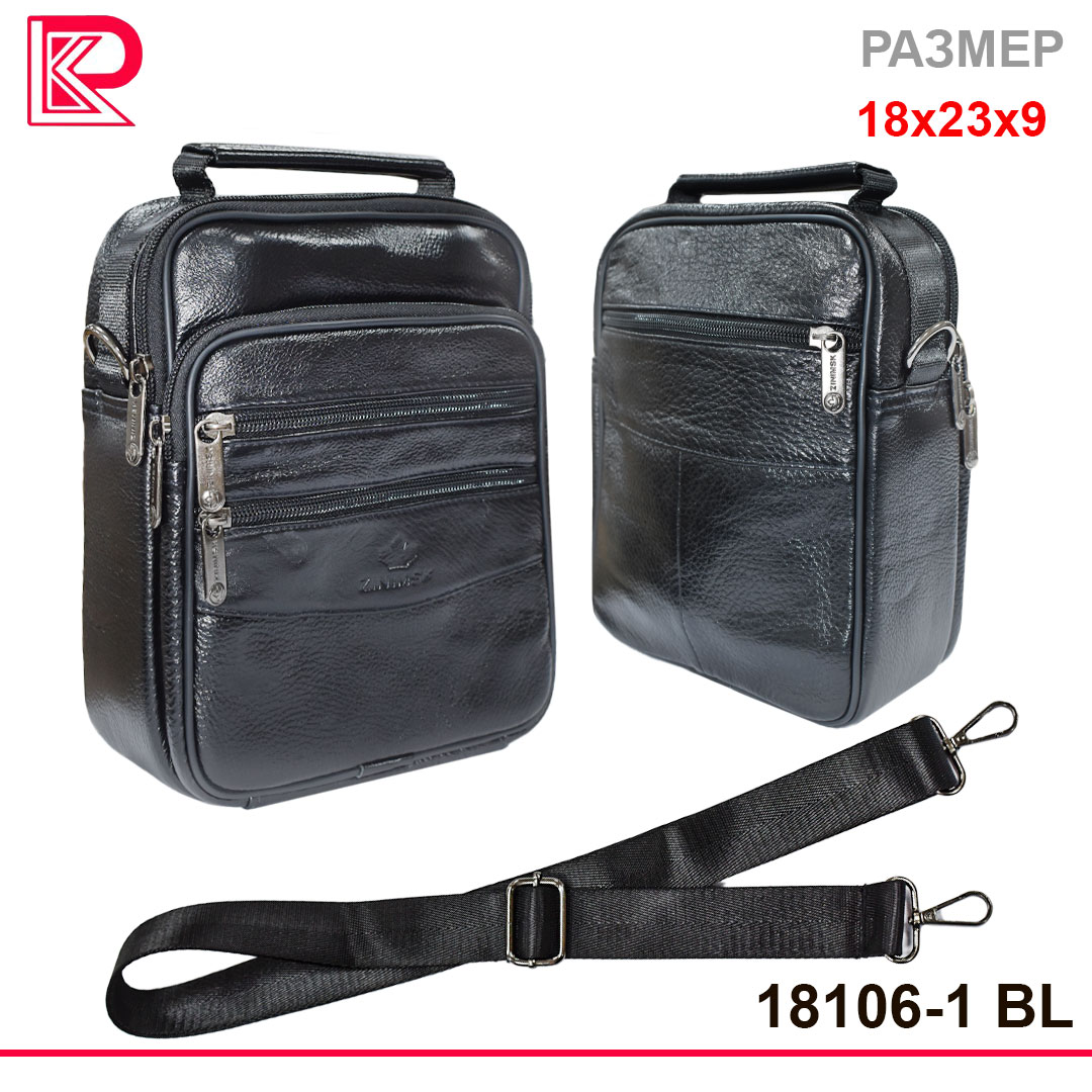 Вертикальная мужская сумка из натуральной кожи, снабжена удобной ручкой для переноса в руках и съемным ремнем с карабинами в комплекте. Центральное большое отделение закрывается на молнию. В нем имеется небольшой дополнительный карман для документов с застежкой-молнией. На лицевой внешней стороне модели - второе отделение поменьше и 2 кармана на молнии. Тыльная внешняя сторона также имеет дополнительный карман. Изделие украшено тиснением логотипа. Упакована сумка в пакет.