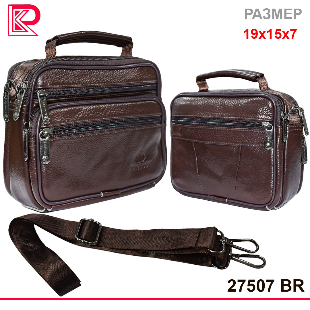 Мужская сумочка из натуральной кожи для носки на поясе с регулируемым ремнем на защелке. Основное отделение закрывается на замок - молнию. Внутри - дополнительный карман. На лицевой внешней стороне модели имеется два кармана на молнии. Изделие украшено тиснением логотипа. Упакована сумочка в пакет.